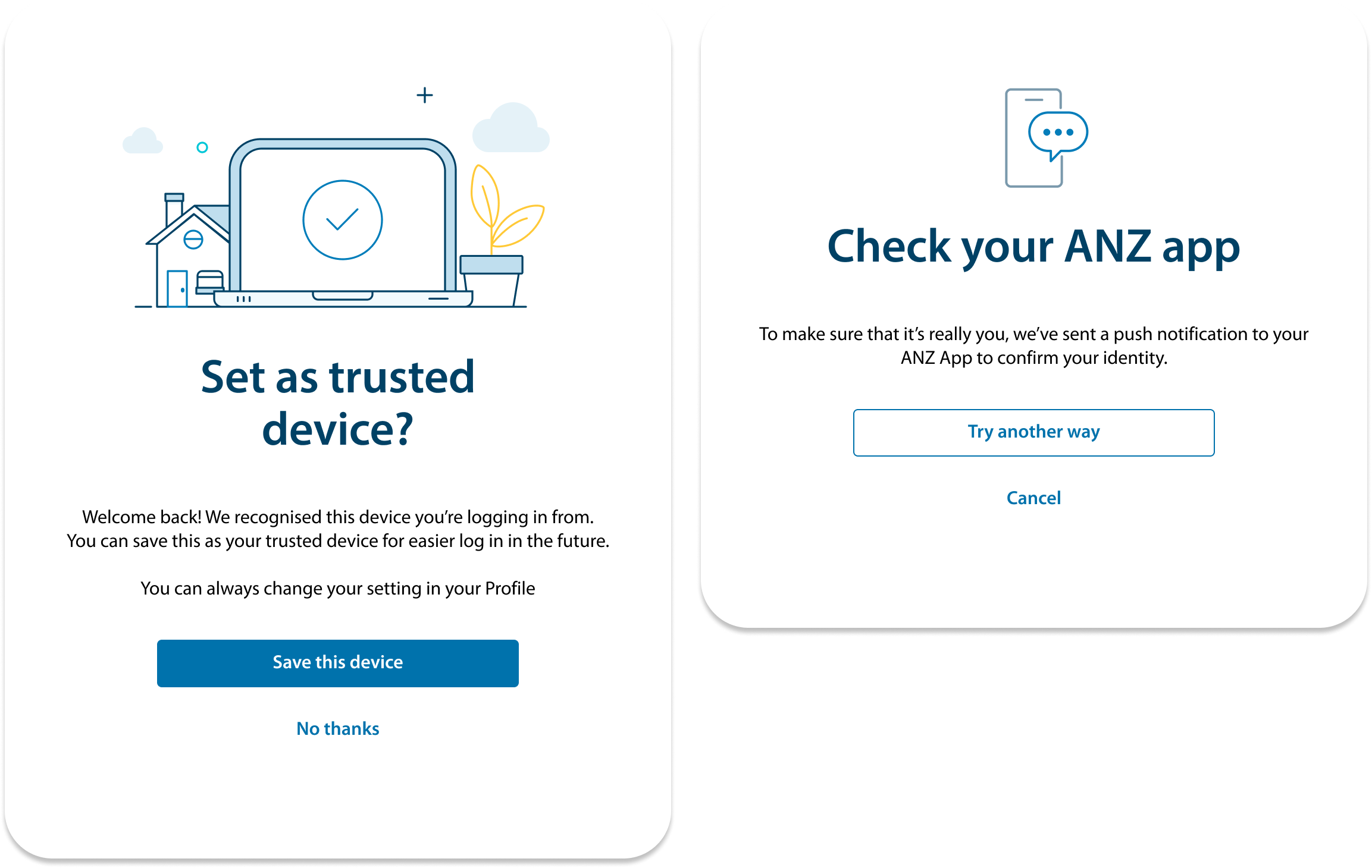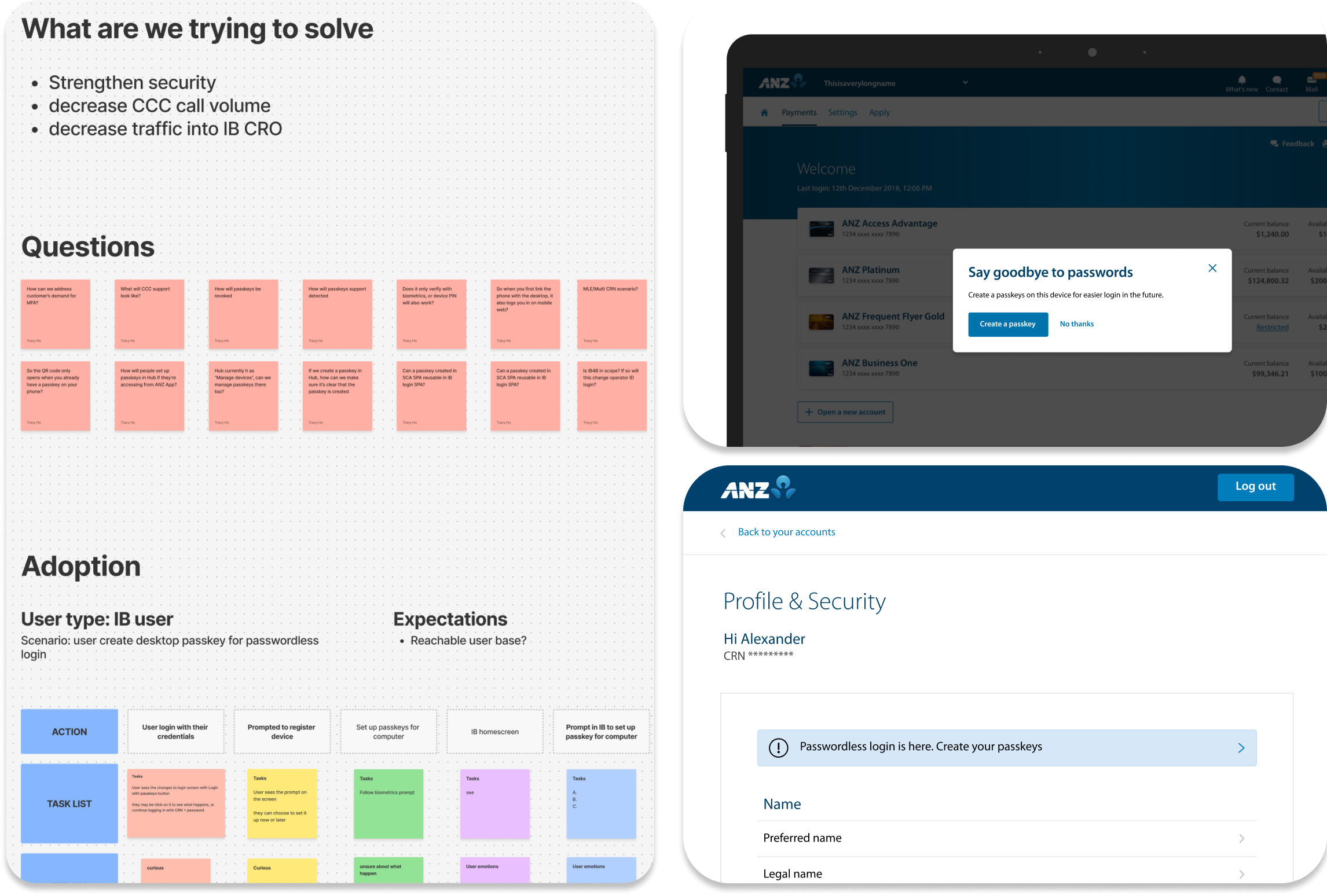 Where passkeys aren't available, I explored alternatives to help customers log in without a password, such as push notification via ANZ app, or ability to set trusted device once customer has successfully authenticated.