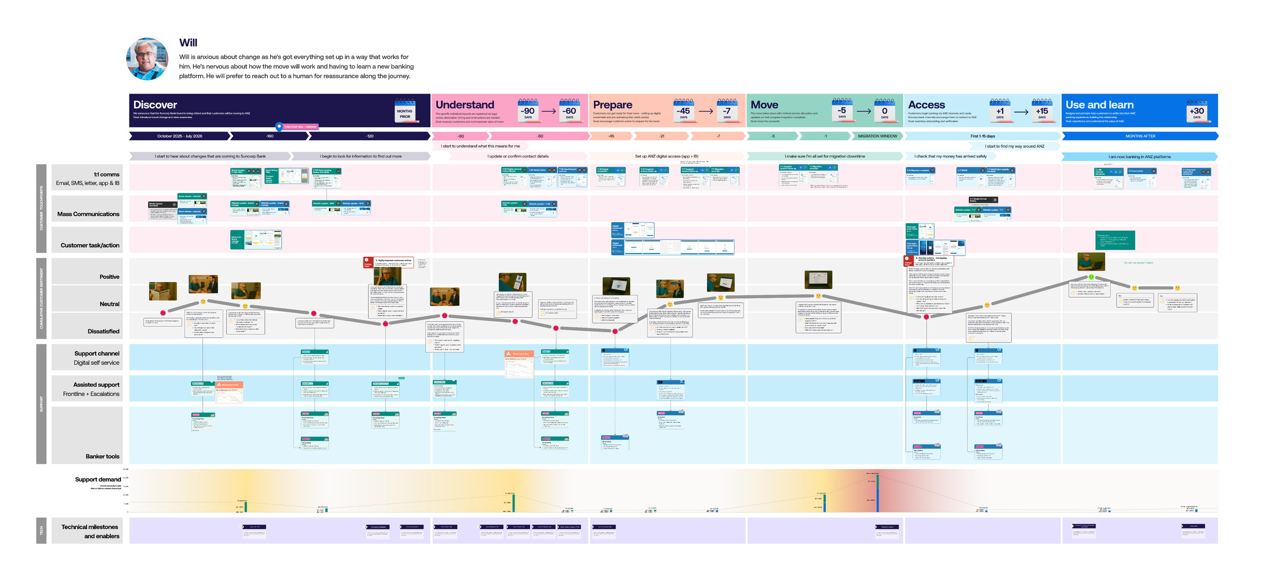 Once I reviewed the archetypes and each customer journey with teams across both banks. I built the service blueprints using AI-generated photos for each archetype, making the customer experience, challenges, and sentiment feel real.