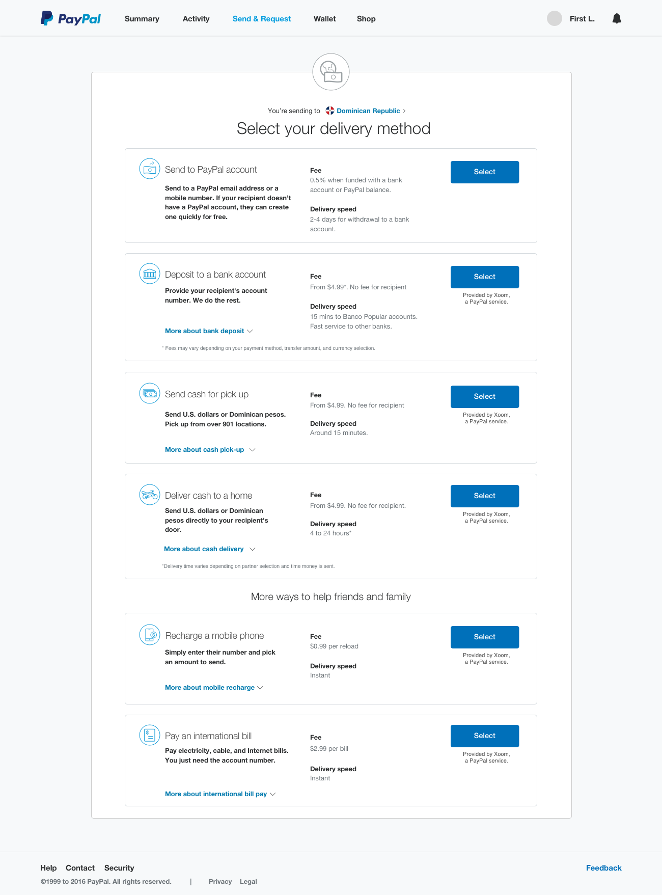 At PayPal, money moves from one PayPal account to another; while on Xoom, the sender can select up to six different methods in two categories (e.g. cash delivery, mobile reload). The PayPal and the Xoom product teams need to align on how Xoom services are displayed on PayPal.