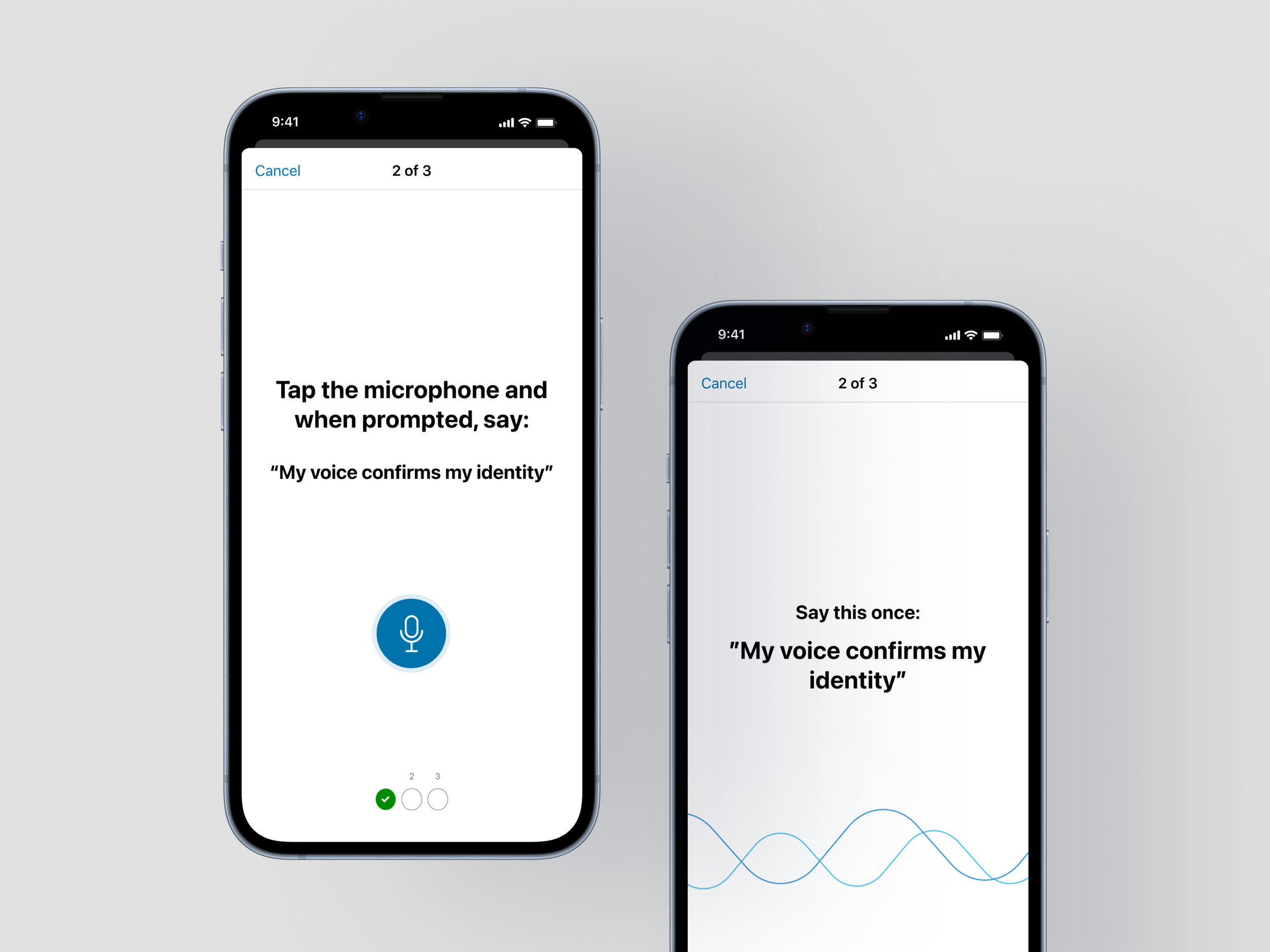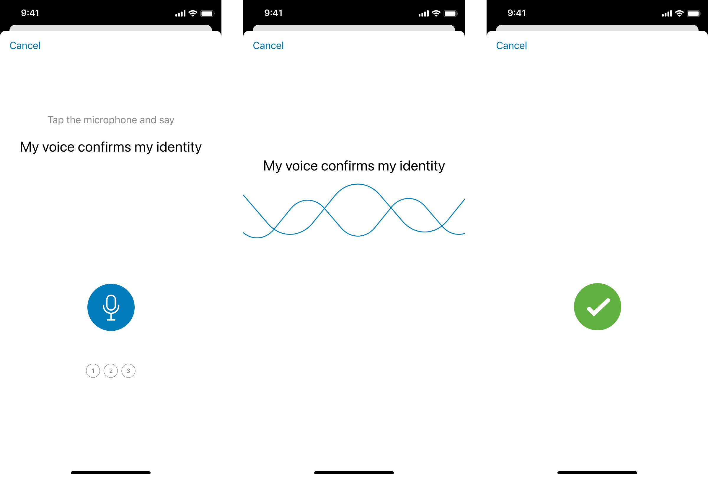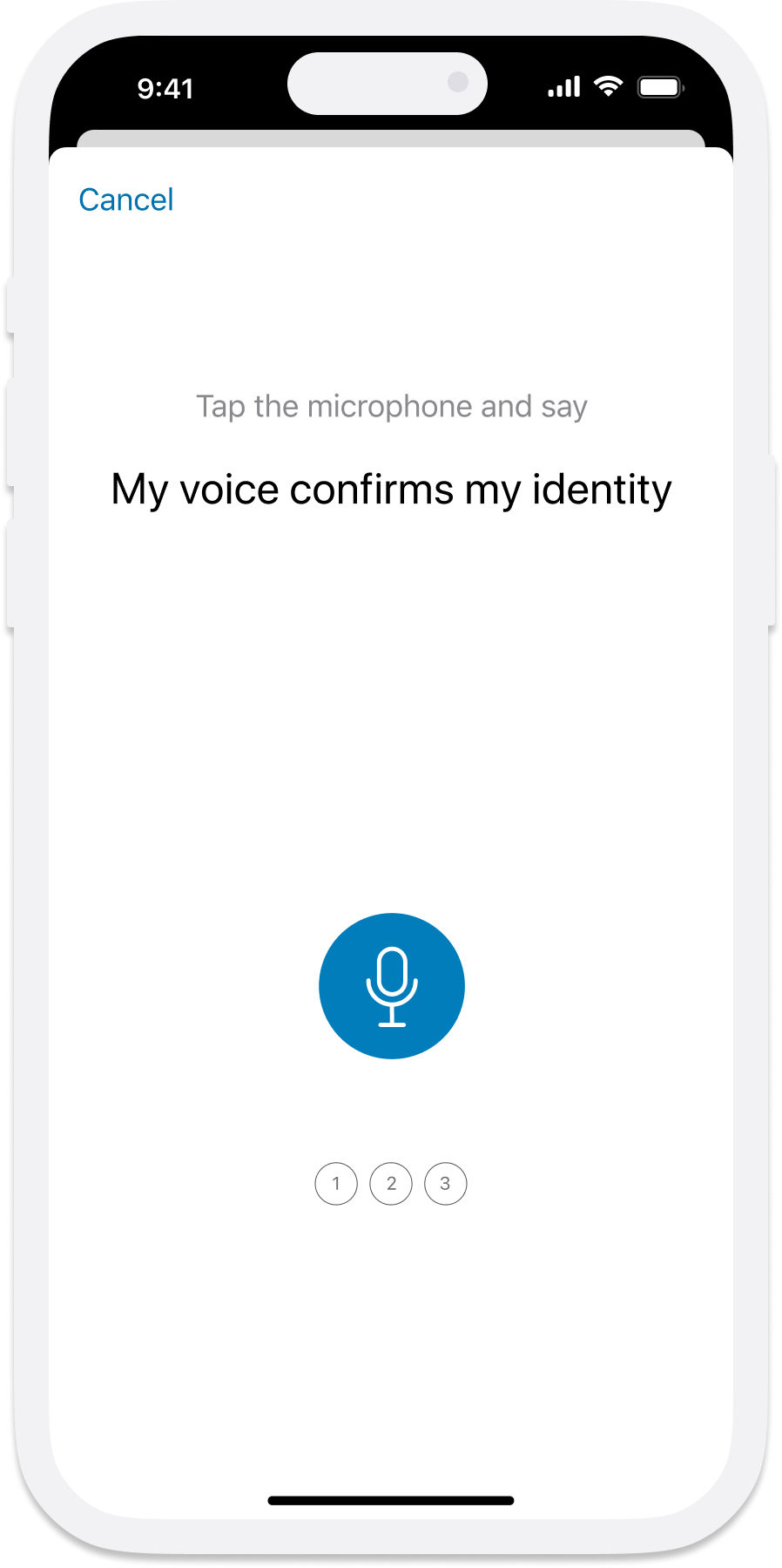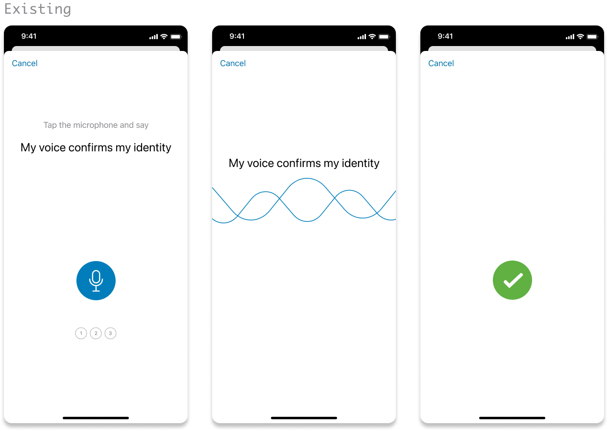 Replicate the registration flow for a consistent experience – introducing the microphone button, apply the split instructions and real time confirmation during speech.